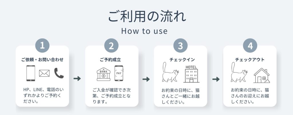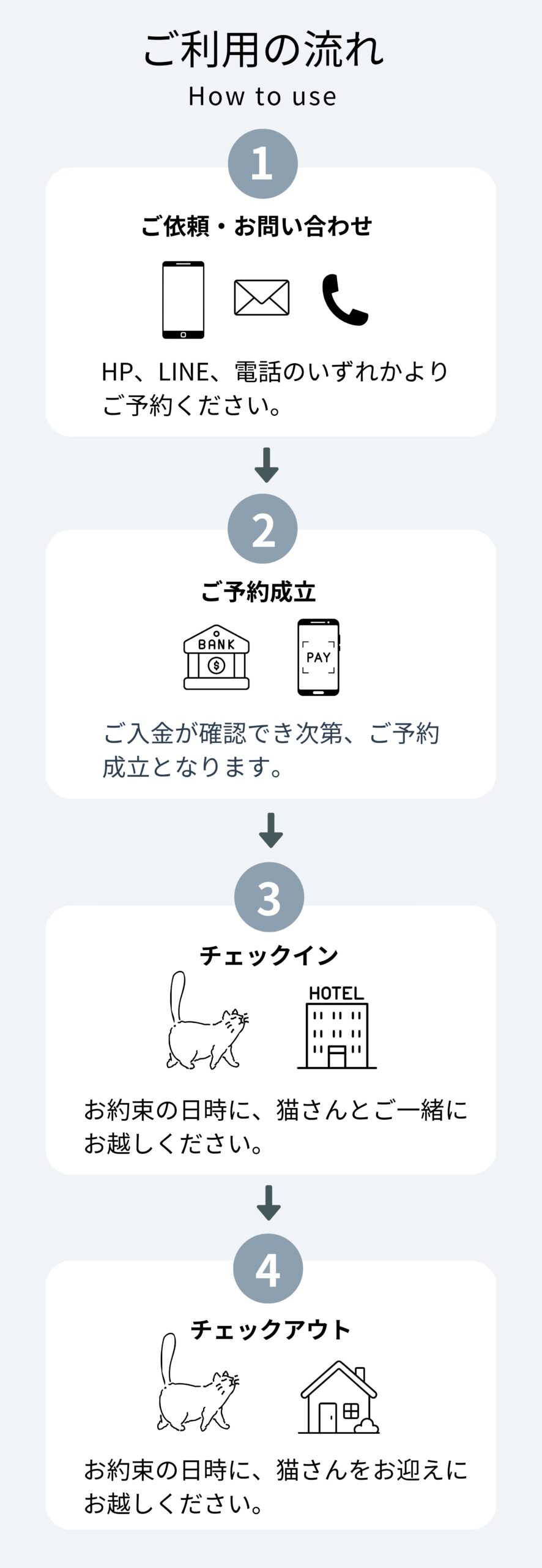 猫さんが安心して過ごせるよう、一匹一匹の性格や普段の生活スタイルに合わせて、その子に合った方法でのお世話をさせていただいております。初めてのご利用でも安心していただけるよう、 ご予約からチェックアウトまで丁寧にサポートいたします。