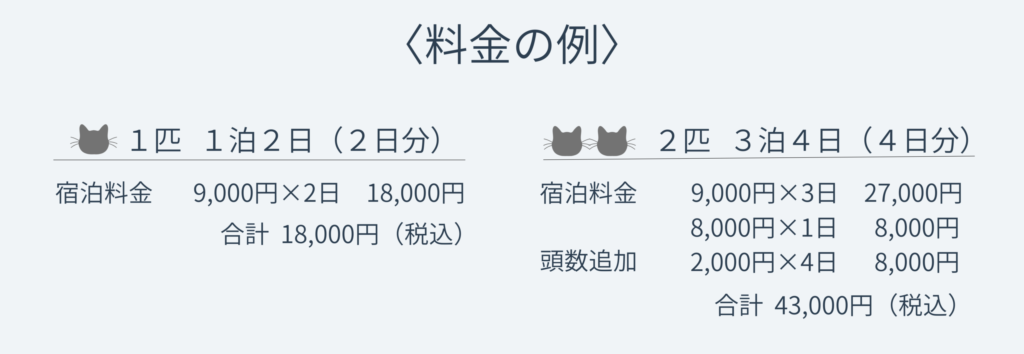 宿泊中の通常サービスとして、1日2回のお世話(食事やトイレ等)、スキンシップ、LINEかメールのレポート、見守りカメラの共有などが含まれます。ねこさんのご自宅への送迎オプションもご相談可能です。