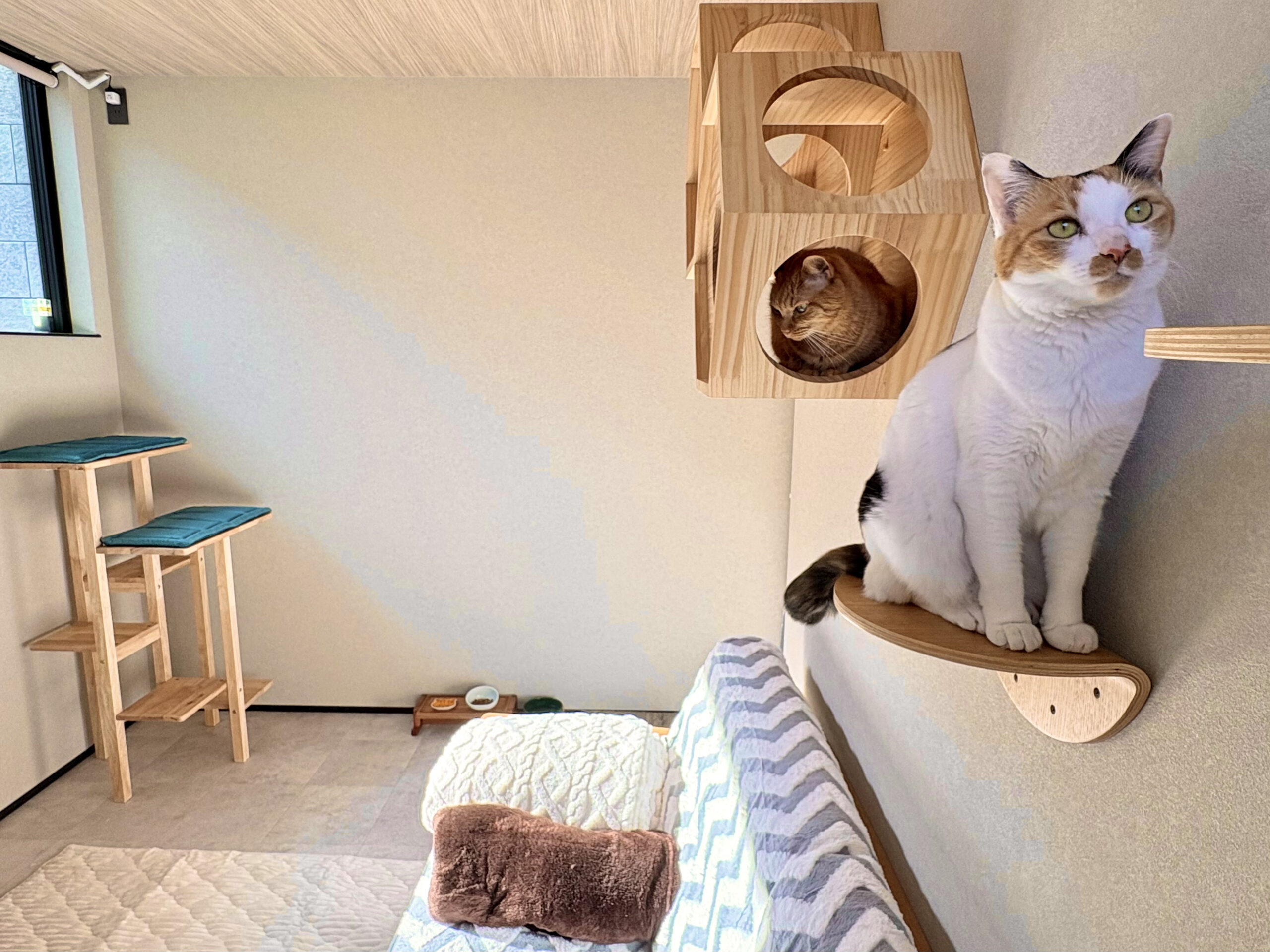 陽が差し込む見晴らしの良い窓、のんびりとお外を眺められるキャットステップ 、ねこさんがリラックスして過ごせるベッド、上下運動をしたりてっぺんでオネンネも出来るキャットタワーなど、ねこさんが喜ぶ設備・アイテムをたくさんご用意しております。