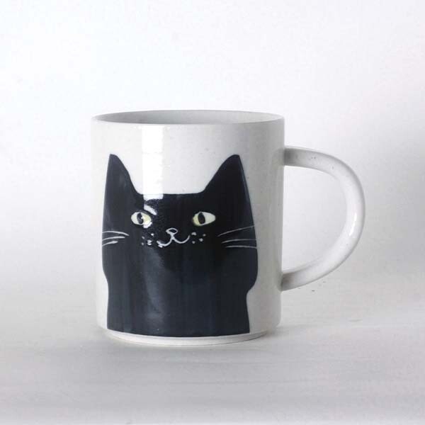 猫のイラストがあしらわれた、やわらかな佇まいのマグカップ。