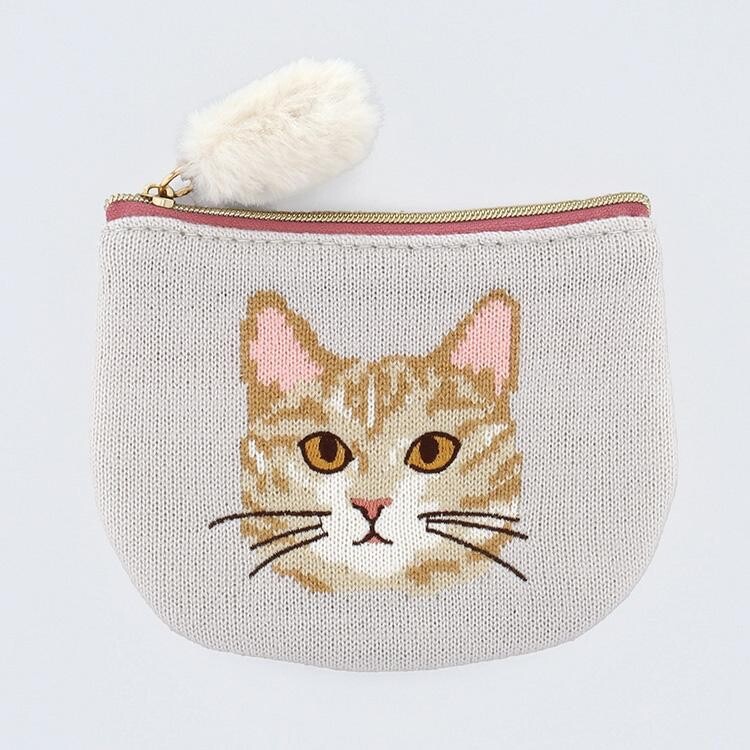 やわらかなブラウンの毛並みが愛らしい、キジトラ猫の刺繍ポーチ。