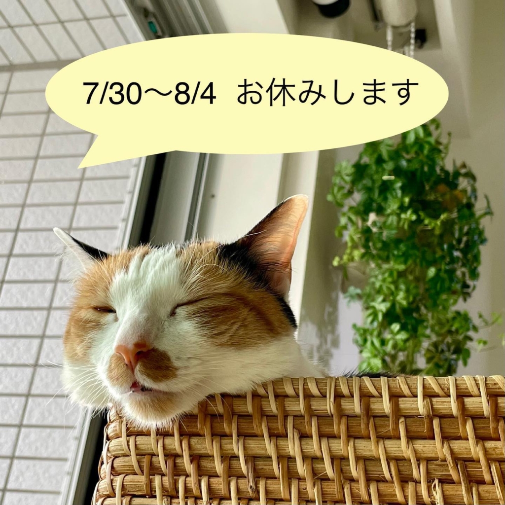 いつもご利用いただき、ありがとうございます。当店都合により、7月30日(金)〜8月4日(水)までお休みをさせていただきます。ご不便をおかけいたしますが、どうぞよろしくお願いいたします。