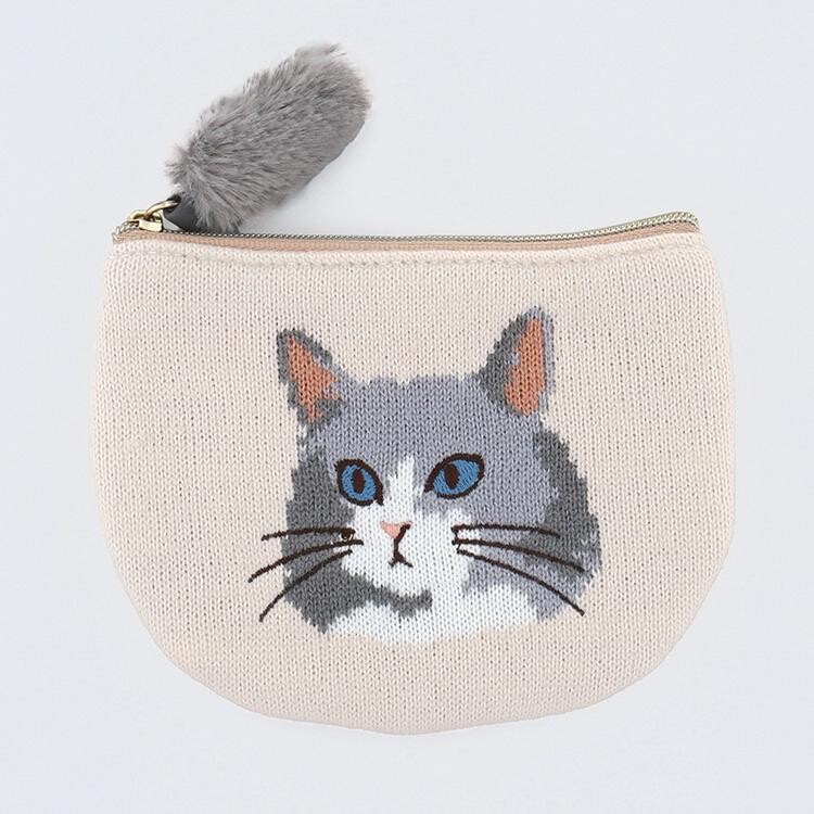 落ち着いたグレーの毛並みに、澄んだブルーの瞳が印象的なニット製の猫ポーチ。